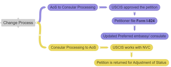 To change from AoS to Consular Processing, a petitioner must inform USCIS of the decision. File Form I-824, Application for Action on an Approved Application or Petition, to make the request for Consular Processing.